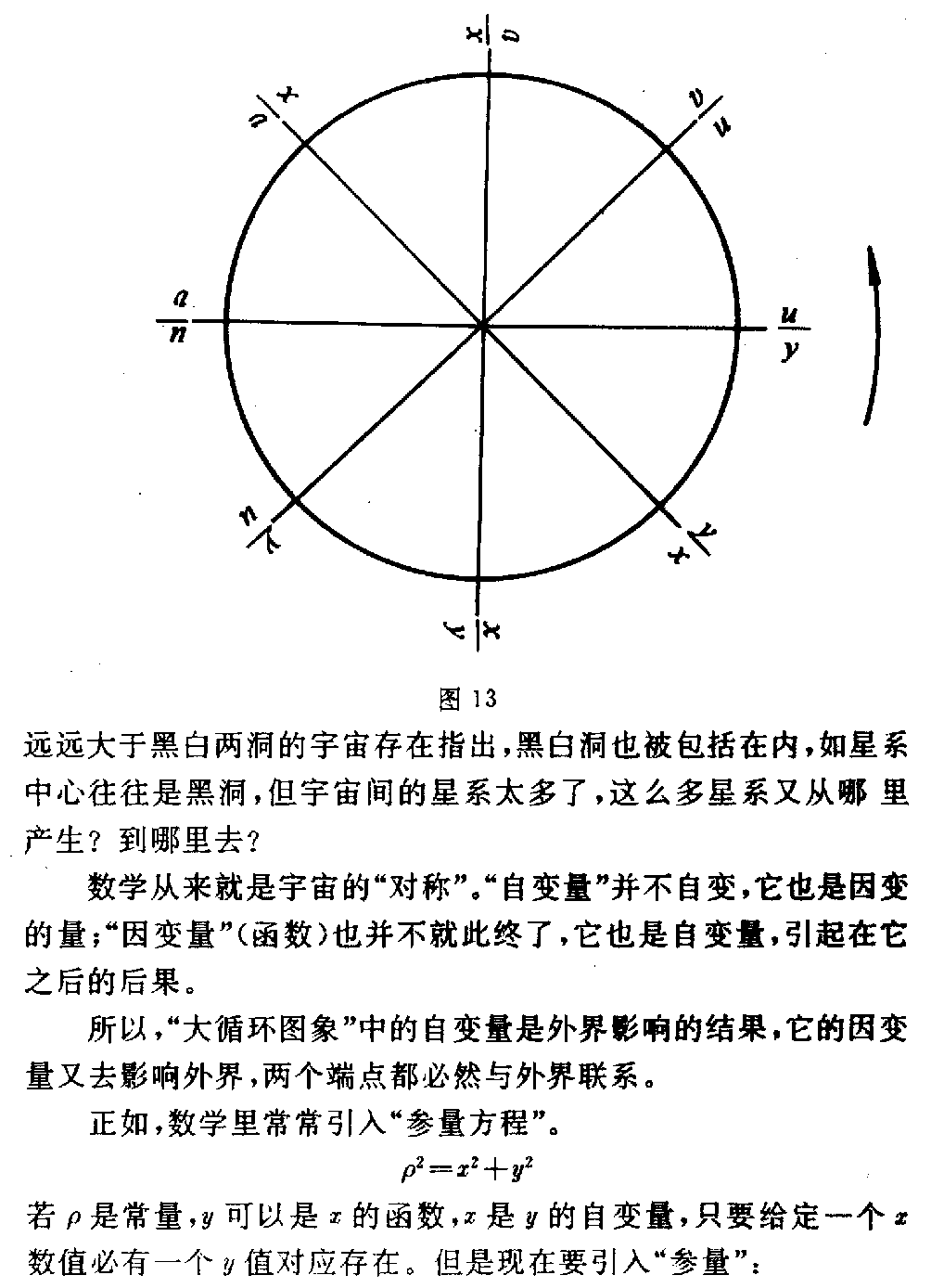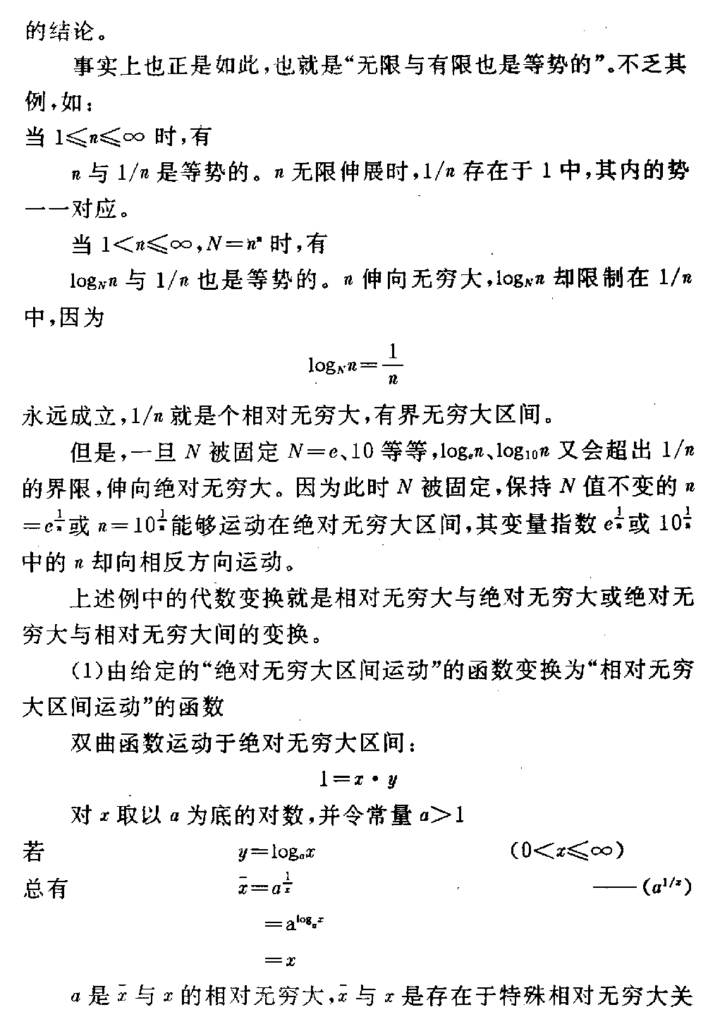 下载微积分的代数根源及其代数化研究(二) (一)关于超超越函数 1.超超越函数的几个性质 (1)超超越性 函数F=xx(0<x≤∞)相似于指数函数,又相似于幂函数,F的 底数与指数都是同一个x,同步变化。 如,F被确定为:e(纳别尔数)4,10,27…;x也同时被固定为:h, 2,h10,3…与F对应。 这里h=1.763222834… h10=2.506184147… x从1开始连续运动向无穷大时,F同时也连续运动向x的x次方延伸向无穷 大,但F的运动速度比x的运动速度超前x次幂,函数F的这个性质称为“超 超越性”,称函数F为“超超越函数”。xx中的底数X称为“变量底数” ,指数称为“变量指数”。 (2)极小值 在区间0<x<1内,函数F有极小值。 x→0时,F→1, x→1时,F→1, 其极小值为F′=0时的x=xmin F′=xx(lfx+1)=0 其中 必有xx≠0(lfx =logFx) lfx+1=0 F-1=Xmin 当F=e时,Xmin=e-1=ε 故Fmin=εε=0.692 200 628… (3)常量,自变量与因变量的相对性 若F=e=xx 表成x=e1x时 ——(e1/x) e1x中的x称为自变量,等于x即为因变 量。 当超超越函数被固定为某一常数后,如 a=xx a1x=—— (a1/x) 其变量底数x成为函数,变量指数成为自变量,并该新 函数是(a1/x)形的指数函数。此时将函数x记为, 显然≠x。 由于F被固定为常量,引起F中的变量底数x成为新的函数,变量指数x成为 新的自变量。现在,我们令a=e,并对(e1/x)式取以 e为底的自然对数 ln=lne 1x =1x 要注意的是此时 =x=h,x与又被固定为常量 x=h上。若令y=ln 变成自变量,y是因变量,有 y·x=1 此时的x已不是,而是变量指数x成为了自变量。 被埋没在ln中,以y整体表现出来成为因变量。 对(e1/x)取自然对数,出现 x·ln=1 x·lne1x=1 x·1x=1 x=x恒等 由于上述基本过程:对F函数,(a)因定F为定常数,F=a=xx形中x 也被固定为常数ha;(b)改形为=a1 x,则变成函数,x成为自变量,x离开ha; (c)取以a为底的对数,loga=1x,x与又被固定为常数ha; (d)令y=loga,则y·x=1,x又变成自变量,为中间函数,y成为最后的函数。 但此时x=1y又出现。 构成一个常量、自变量、因变量的循环运动。这是F函数的特殊性质。 它要求改变以往对常量、自变量,因变量一成不变的“固有成见”。 (4)守恒性与完整性 出现x=x 变量的恒等,我们称为“守恒性”。考虑性质(3)该变量守恒的来源知道,这 里的x是开始的变量指数形成的自变量,不是变量底数的守恒。 这说明函数的来源就是守恒的。因此,守恒性将函数的基本存在形式固定下来。 当然也可以任取其一为函数,另一x为自变量进行另一轮的循环 运动: x= x·1=1 x·logF=1 F=x 新的循环在旧的循环运动基础上衔接形成“螺旋扩大的循环”运动,或“螺旋 缩小的循环”运动。 但只有F不被固定为常量才能形成这种螺旋扩大(缩小)的循环运动。变量的 守恒关系,表现出变量运动的完整性。 因为螺旋扩大(缩小),不断运动(F不被固定),变量并不守恒,单就一次循环 观察(静止的相对观察)在一次循环内变量又是守恒的,可以建立 x=x 一般情形应当F是变量 X·1=1 logF=1x “螺旋”并不准确,乃“变底对数与双曲函数的对等”。我们因为F的变动, 所以还叫不出它的运动形状。实际上它是个平面。 2.绝对无穷大与相对无穷大的对应关系及其代数变换 康托尔在集合论中说:“部分的元素个数可以等于整体的元素个数”,“任一 线段都与整条线段等势”。 庄子说:“一尺之棰,日取其半,万世不竭”。 他们都是说,有限之内有无限的“元素”、“势”,且可以对等。 反之,既然部分的元素个数与整体的个数相等,所谓“整体”仅与部分的相对 称谓,并未限定“整体”的边界,如果 将“整体”的边界每扩大一次(不 限制扩大多少)都与部分的元素对应一次,按 康托尔的集合论,它们的元素 个数也应相等。当把这种扩大的次数与每次扩大都对应一次元素的个数(总是 相等)无限发展下去,就会得出“无限扩大的整体元素个数与有限的部分元素 个数仍然相等”的结论。 事实上也正是如此,也就是“无限与有限也是等势的”。不乏其例,如: 当1≤n≤∞ 时,有 n与1/n是等势的。n无限伸展时,1/n存在于1中,其内的势一一对应 。 当1<n≤∞,N=nn时,有 logNn与1/n也是等势的。n伸向无穷大,logNn却 限制在1/n中,因为 logNn=1n 永远成立,1/n就是个相对无穷大,有界无穷大区间。 但是,一旦N被固定N=e、10等等,logen、log10n 又会超出1/n的界限,伸向绝对无穷大。因为此时N被固定,保持N值不变 的n=e1n或n=101 n能够运动在绝对无穷大区间,其变量指数e1n或101n中的n 却向相反方向运动。 上述例中的代数变换就是相对无穷大与绝对无穷大或绝对无穷大与相对无穷 大间的变换。 (1)由给定的“绝对无穷大区间运动”的函数变换为“相对无穷大区间运动 ”的函数 双曲函数运动于绝对无穷大区间: 1=x·y 对x取以a为底的对数,并令常量a>1 若y=logax(0<x≤∞) 总有=a1x ——(a1/x) =alogax =x a是与x的相对无穷大,与x是存在于特殊相对无 穷大关系(a1/x)中的。演进后,这种关系就是变量守恒(恒等) 关系; =x 它是封闭式的变量恒等。 (2)由给定的“相对无穷大区间运动”的函数变换为“绝对无穷大区间运动 ”的函数。 若给定一个封闭的变量守恒式; =x(x自变量, 函数) 总可得=alogaxa> 1 因为logax=1x存 在 则x·logax=1 显然又可·y=1(x=) 成为开放型的双曲函数关系。 若只从数学角度看,(1)是由乘法xy=1变换为除法·1x=1(2)是由除法·1x =1变换为乘法y=1。中间借助于logax=1x 总是存在的关系导来。 那么,由x·1x=1,x·y=1 两式直接相 互变来变去,不是也一样可以的吗! 当然可以,